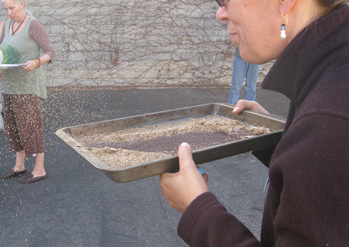 Winnowing is the step of separating the seed from the rest of the seed head material and chaff. On moderately windy days, this can be done by gently tossing seeds into the air for the wind to catch the chaff, although this requires practice and a reliably consistent wind speed. The chaff can also be separated by swirling the seed material in smooth metal bowl, collecting the chaff on top, then tipping the bowl and blowing the chaff away. Before winnowing, consider separating most of the chaff out of the seeds by using screens of various dimensions.